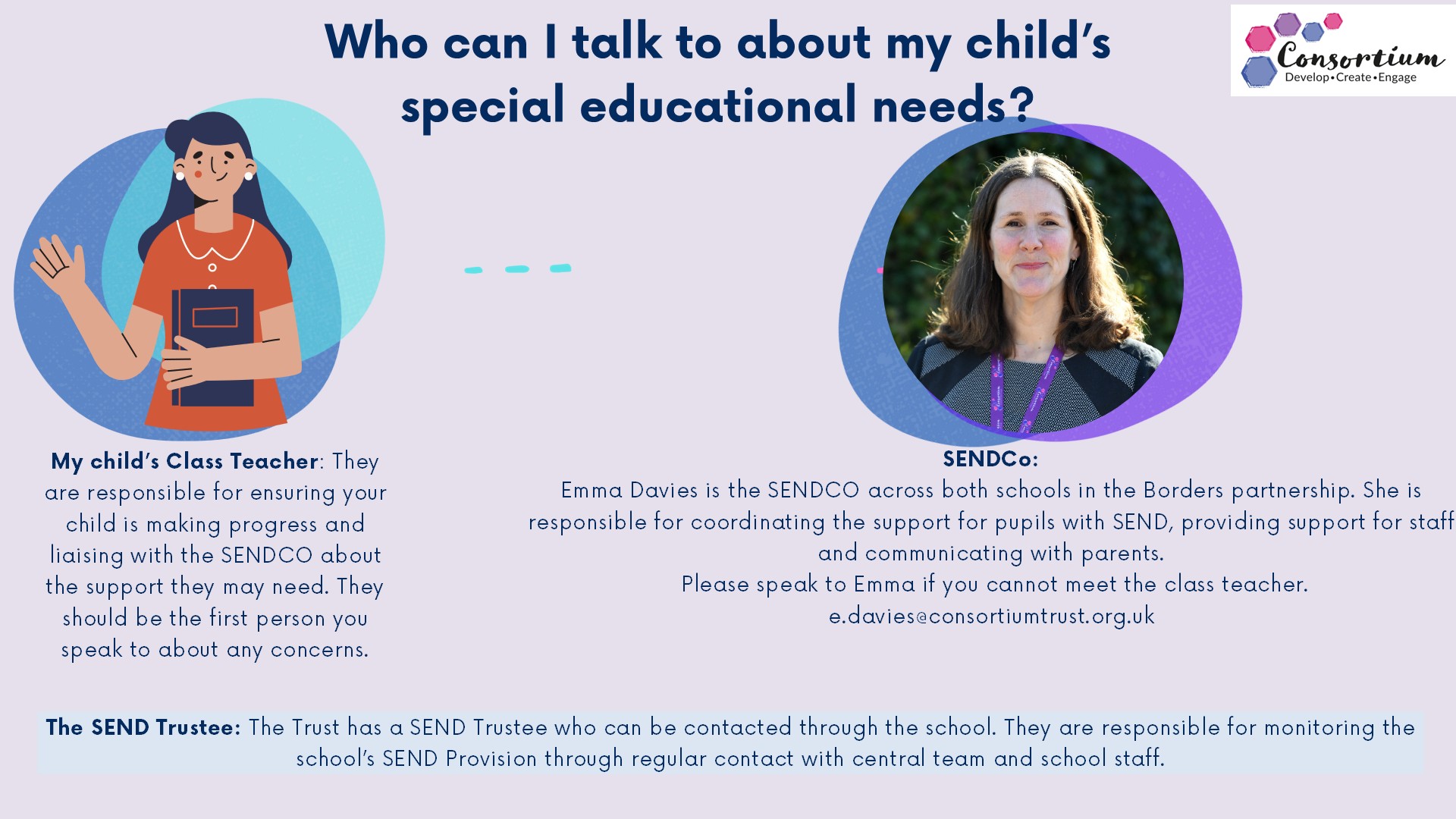 She can be contacted via email at; e.davies@consortiumtrust.org.uk