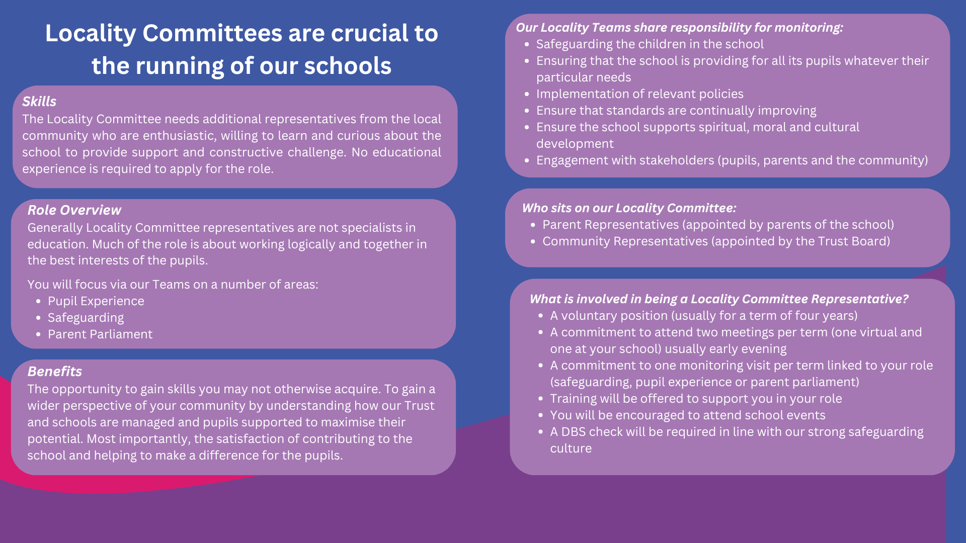 A Trustee's role in a charity is to be the 'guardians of purpose', making sure that all decisions put the needs of the beneficiaries first. They safeguard the assets – both physical assets, including property, and intangible ones, such as its reputation. The Consortium Trust has appointed a robust Board of Trustees, with the requisite skills, knowledge and integrity to provide the strategic challenge and direction of the Trust at every level.